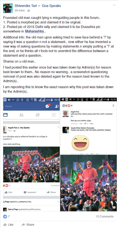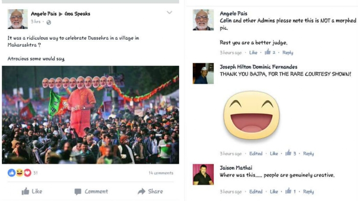 गोवा विधानसभेच्या निवडणूका आता जवळ आल्या आहेत. साहजिकच प्रत्येकच राजकीय पक्ष त्यासाठी मिळेल त्या माध्यमातून आपल्या विचारांचा आणि पक्षाचा प्रचार करत आहे. फेसबुकवर त्यासाठी गोवा स्पीक्स सारख्या माध्यमांचा सर्रास उपयोग होताना दिसतो. नुकताच दसरा होऊन गेला. देशभरातीलच नव्हे तर जगभरातील भारतीयांसाठी हा विशेष सण. हिंदू संस्कृतीतील साडेतीन मुहूर्तांपैकी एक. साहजिकच त्यादिवशी सर्वत्र रामलीला आणि रावणदहन अनेक कार्यक्रम होतात. आणि त्याचे अनेक फोटोही आजकाल सोशल मीडियावर फिरत असतात. मात्र त्यातही काहीजण चावटपणा करतात आणि मग टीकेचे धनी होतात. या गोवा स्पीक्स च्या फेसबुक पानावरही असाच एक खोडसाळपणा एका सदस्याने केला. एन्जेलो पायस असे या सद्गृहस्थाचे नाव. त्यांनी मुद्दाम दसऱ्याला नरेंद्र मोदींच्या पुतळ्याचे महाराष्ट्रात दहन झाले अशा आशयाचा फोटो टाकला. अर्थातच तो खोटा होता. फोटोशॉपमध्ये मॉर्फ करून अपलोड केलेला होता. त्यामध्ये मोदींच्या कटआऊटला १० तोंडे दाखविण्यात आली आहेत. आणि त्याखाली महाराष्ट्रात रावणरूपी मोदींच्या पुतळ्याचे दहन अशा आशयाच्या काही ओळी लिहिल्या आहेत.