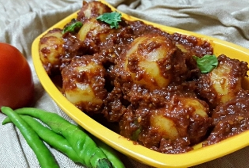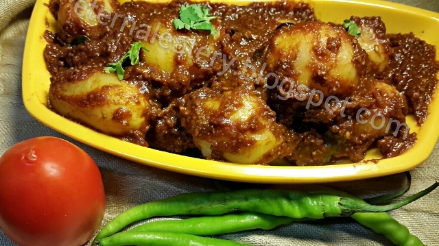 आता या लाल ग्रेव्ही तयार झालेल्या भांड्यात बटाटे बिनधास्त सोडा आणि सर्व बाजूंनी हलकेच फिरवत फिरवत सगळ्या मिश्रणाचे कोटिंग बटाट्यांना मस्त कवेत घेवू द्या....