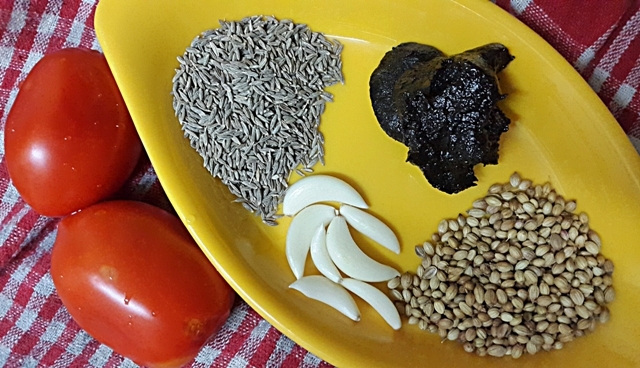 मिक्सरच्या लहान भांड्यात आता धने , जिरं आणि लसणाच्या पाकळ्या एखाद दोन वेळा फिरवून घ्या...पाणी न घालता आहेत तश्याच...आता हे मिश्रण एखाद्या वाटीत बाजूला ठेवा...