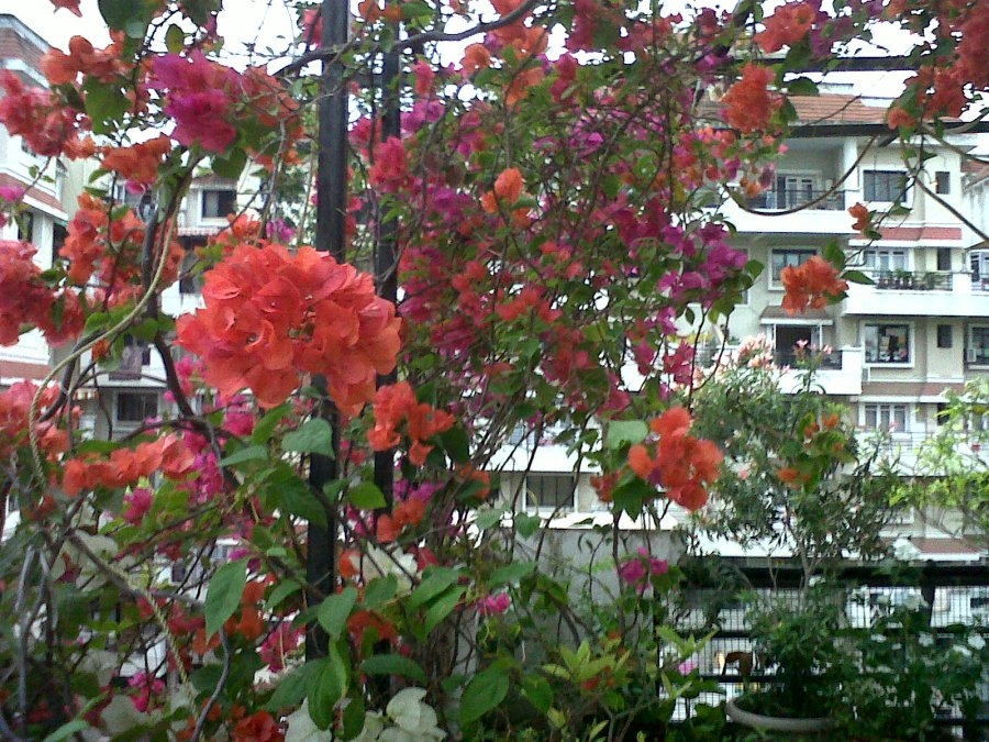 तुळस, मनिप्लाण्ट, झेंडू अशा बाल पाउलांनी झाडांनी एन्ट्री घेतली. अलगद बहरत जाई, जुई, सायली, मोगरा, शेवंती, मधुमालती, करत करत गुलाबा पर्यंत मजल गेली. वेली चढवायला एक मांडव बांधला. त्याच्यावर बोगनवेलीच्या लाल, डाळिंबी, केशरी फुलांनी रंगांचा धिंगाणा घातला! बोगनवेली बरोबरच स्वस्तिक, सदाफुली, कण्हेरीच्या झाडांनी सतत बाग प्रफुल्लीत ठेवली. त्यात एक पांढऱ्या चाफ्याचे झाड होते. ते फारच मोठ झाल्यावर शेतावर नेउन लावलं.