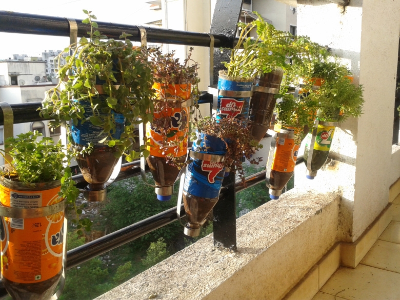 मधल्या काळात नरेंद्रने प्लास्टिकच्या बाटल्यां मध्ये छोटी शोभेची झाडे लावून hanging garden चा अभिनवप्रयोग केला. हा प्रयोग eco-friendly तर झालाच, पण नयनरम्य पण! त्याच्या देखभालीसाठी फार वेळ लागत असल्याने पुढे हे प्रकरण बंद पडले.