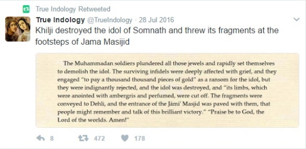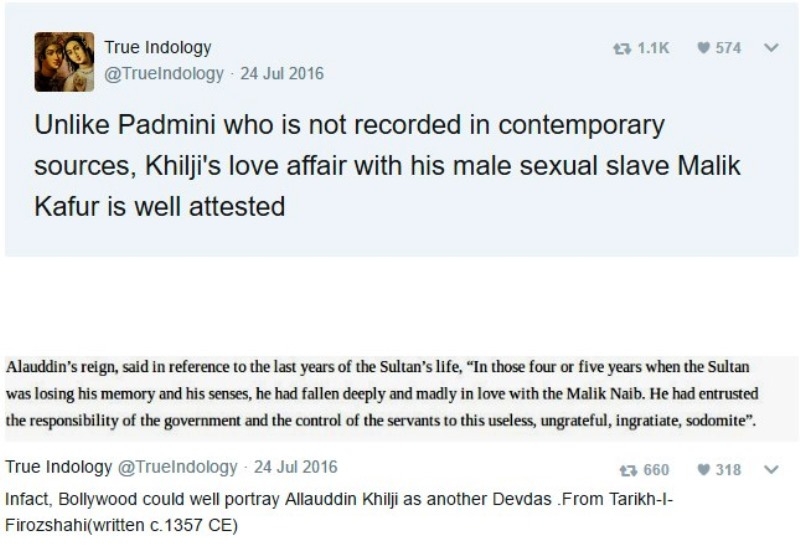 अल्लाउद्दीन खिलजी, तैमूर, गझनीचा महमूद, टिपू, औरंगझेब हे सगळ्या मुसलमान राज्यकर्त्यांनी हिंदू प्रजेवर अतोनात जुलूम केलेले आहेत. पण आजकाल 'इतिहासाचे कलात्मक चित्रण' ह्या गोंडस नावाखाली ह्या सगळ्यांचे सरसकट उदात्तीकरण केले जात आहे. त्यांनी जर काही देवळे उध्वस्त केली असलीच तर हा केवळ 'राजकीय' निर्णय होता, त्यामध्ये धार्मिक उन्मादाचा जराही भाग नव्हता अश्या प्रकारची मखलाशी सतत केली जात आहे. काही वर्षांनी भारताची नाव पिढी हाच विकृत इतिहास खरा मानून चालेल अशी परिस्थिती आहे.