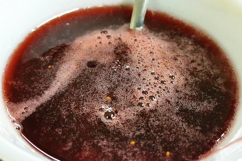 द्राक्ष आणि स्ट्रॉबेरीज पूर्णपणे विरघळून बर्यापैकी एकजीव होतात आणि या दोन्ही फळांचा साधारण दृश्य स्वरूपात लगदा तयार होतो.