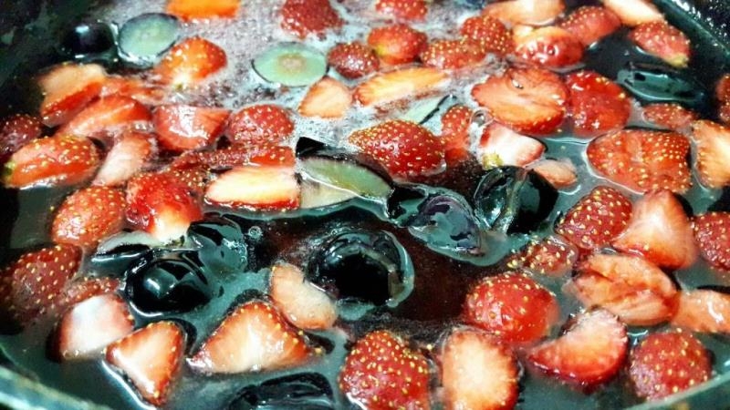 आता या साखरेच्या द्रावणात अर्ध्या स्ट्रॉबेरीजचे मगाशी केलेले तुकडे घाला आणि सगळ्या द्राक्षांचे केलेले तुकडे नंतर घाला आणि आता विस्तव लहान ठेवून आता हे सगळे मिश्रण साधारण १० मिनिटे ढवळत रह.