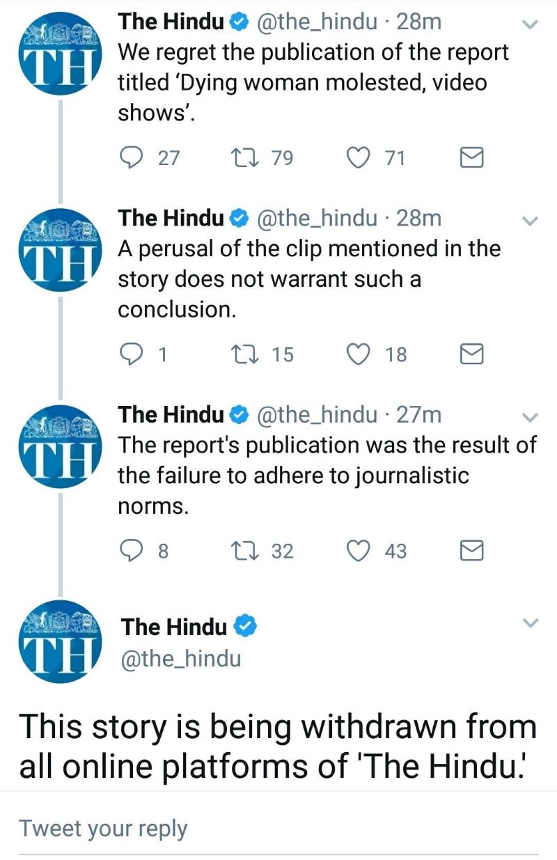 अपघातात सापडलेल्या एका असहाय्य बाईला वाचवण्याचा शर्थीचा प्रयत्न करणाऱ्या एका निष्पाप माणसाला द हिंदूने खलनायक बनवलं. मृत्यूच्या दाढेत असणाऱ्या बाईची छेडछाड करणारा नराधम असं भयानक लेबल त्याला चिटकवून टाकलं, तेही काहीही सबळ पुरावा नसताना.