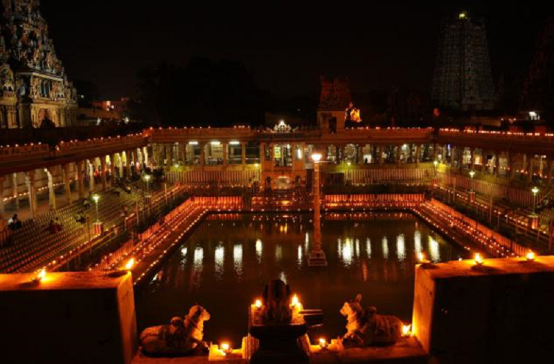 कार्तिक पौर्णिमेसाठी दिव्यांनी सजलेले तामिळनाडूचे अरुणाचलेश्वर शिव मंदिर. इथे कार्तिक पौर्णिमेचा उत्सव सौर कॅलेंडर प्रमाणे साजरा केला जातो. या उत्सवाला कार्थिकै दिपम् किंवा कार्थिकै ब्रह्मोत्सव सुद्धा म्हणतात.