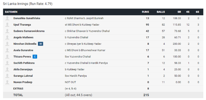 विशाखापट्टणम् येथील डी.एस. राजाशेखरा रेड्डी मैदनावर सुरु झालेल्या या सामन्याच्या सुरुवातीला भारतीय संघाने नाणेफेक जिंकून प्रथम गोलंदाजी करण्याचा निर्णय घेतला होता. यानंतर श्रीलंकेकडून धनुष्का गुणतिलका आणि उपुल थरंगा हे दोघे सलामीसाठी मैदानात उरले होते. श्रीलंका संघाला चांगली सुरुवात करून देत असतानाच गुणतलिकाला १३ धावांवर माघारी धाडण्यात भारतीय गोलंदाजाना यश आले. परंतु यानंतर उपुल थरंगा (९५) याने सदीरा समरविक्रमाच्या (४२) जोडीने दुसऱ्या क्रमांकासाठी १२१ धावांची भागीदारी रचून श्रीलंकेचा पाया मजबूत करून दिला. परंतु समरविक्रमा आणि थरंगानंतर आलेल्या एकाही खेळाडूला कोणतीही चमकदार कामगिरी करता आली नाही. अँजेलो मॅथ्यूज (१७) आणि असेला गुणरत्ने (१७) वगळता श्रीलंकेच्या एकाही खेळाडूला साधी दोन आकडी धावसंख्याही गाठता आली नाही.