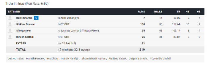 उपुल थरंगा याच्या ९५ धावांच्या खेळीच्या बळावर श्रीलंकेने भारतासमोर विजयासाठी २१६ धावांचे आव्हान ठेवले होते. श्रीलंकेच्या डावानंतर भारताकडून कर्णधार रोहित शर्मा आणि शिखर धवन ही जोडी मैदानात सलामीसाठी उतरली होती. परंतु थोड्याच वेळात श्रीलंकेच्या धनंजया याने रोहितचा त्रिफळा उडवत त्याला माघारी धाडले. यानंतर मैदानात आलेल्या शिखर धवन याने तुफान फटकेबाजी करत श्रेयस अय्यरच्या जोडीने दुसऱ्या क्रमांकासाठी १३५ धावांची भागिदारी रचली. अय्यरने देखील धवनला उत्तम साथ देत ६५ धावांची दमदार खेळी केली. परंतु लकमल याने पेरेरा याच्या चेंडूवर अय्यरला बाद करत, त्याला देखील तंबूत धाडले. यानंतर दिनेश कार्तिकच्या जोडीने शिखर धवनने ८५ चेंडूमध्ये १३ चौकार आणि २ षटकारांसह नाबाद १०० धावा करत संघाला विजय मिळवून दिला. याच बरोबर आपल्या आंतरराष्ट्रीय कारकीर्दीतील १२ वे शतक आणि ४ हजार धावांचा टप्पा देखील त्याने पार केला.