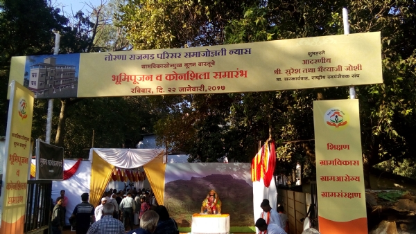रविवारची प्रसन्न सकाळ. तोरणा राजगड परिसर समाजोन्नती न्यासाच्या वेल्हे येथील मुलांच्या वसतिगृहाच्या परिसरात लगबग सुरू होती... आयोजक मंडळी माइक, खुर्च्या, स्टेज व्यवस्थेपासून ते न्याहारीच्या तयारीपर्यंत व्यवस्था लावण्यात मग्न... वसतिगृहापाठीमागेच धीर देत उभा असलेला खंबीर तोरणा किल्ला ! पुणे, सातारा, बारामती वगैरे ठिकाणाहून आलेले हितचिंतक, कार्यकर्ते व त्यांचे कुटुंबीय यांचे स्वागत करण्यासाठी मंडपाच्या प्रवेशद्वारापाशी फेटा बांधलेली आणि सुरवार-कुडता घातलेली शाळकरी मुले स्वागतासाठी सज्ज होती. निमित्त होते ते न्यासातर्फे बांधण्यात येत असलेल्या ग्रामविकासोन्मुख नूतन वास्तूचे भूमिपूजन.