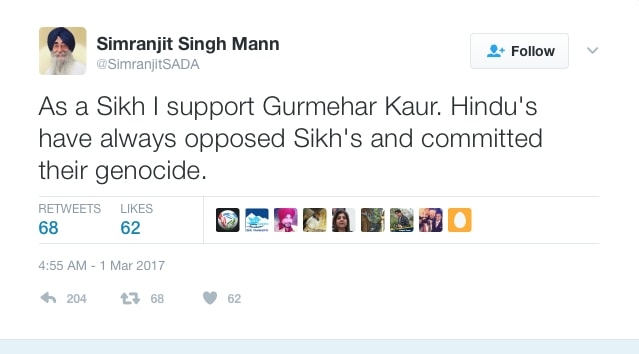 आता तर हे प्रकरण अजूनच ही पातळीवर नेण्यात आलंय. जाणूनबुजून ह्या प्रकरणाला शीख विरुद्ध हिंदू असा रंग देण्यात येतोय. खलिस्तानवादी फुटीर सिमरन सिंग मान ह्यांनी 'शीख म्हणून माझा गुरमेहेरला पाठिंबा आहे. हिंदूंनी नेहमीच शिखांची कत्तल केली आहे', असे प्रक्षोभक ट्विट करून आगीत तेल ओतले आहे. ही भानगड वाटते तेव्हढी साधी नाहीये. गुरमेहेर कौर हे प्यादे पुढे करून एक पद्धतशीर फुटीरतावादी मोहीम रचली गेलेली आहे आणि आम आदमी पक्षाचा ह्याला उघड पाठिंबा आहे.