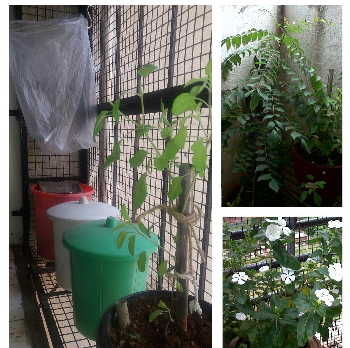 तरी पण ही बाल्कनी रुक्ष नाही बरे! तीच्या बंदिस्त कठड्यावर – तुळस, गवती चहा, मिरची, कडीपत्ता, टोमटो अशी इमर्जन्सी झाडे लावली आहेत. इमर्जन्सी म्हणजे - इकडे चहाचे आदण ठेवले की तिकडून दोन तुळशीची पाने नाहीतर गवती चहाची पाने तोडून त्यात टाकायची. इकडे गॅसवर कढई चढवली की पट्कन तिकडून दोन मिरच्या आणि कडीपत्त्याच्या दोन काड्या तोडून आणायच्या. आणि कधीतरी टोमॅटो मस्त दिसतयात म्हणून कांदा आणि मिरची घालून त्याची छान कोशिंबीर करायची. या झाडांशिवाय कधी - हळद, मेथी, लाल माठ, पुदिना, पालक, कोथिंबीर, कांद्याची पात अशा वेगवेगळ्या भाज्या लावून झाल्या. ‘घरची भाजी’ तोडण्यात आणि करण्यातला आनंद कुछ और ही है!
