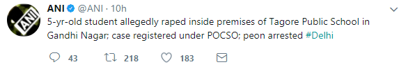 नॅशनल क्राइम रिकॉर्ड्स ब्युरोच्या अहवालानुसार २०१५ पर्यंत एकूण ८८०० बाल लैंगिक शोषणाचे गुन्हे दाखल करण्यात आले आहेत, यामध्ये ८३४१ गुन्ह्यांमध्ये लहान मुले त्या व्यक्तीला ओळखणारी असतात. यापैकी किमान १०% गुन्हे शाळांमध्ये किंवा शाळेशी संबंधित लोकांद्वारे करण्यात आले आहेत. हे आकडे धक्कादायक आहे, त्याहून धक्कादायक ही बाब आहे की, गेल्या २ वर्षात या आकड्यांमध्ये नक्कीच वाढ झालेली आहे. लहान मुलांचे आई वडील खूप विश्वासाने त्यांना शाळेत पाठवतात, असे असताना आपलं मूल शाळेतही सुरक्षित नाही म्हटल्यावर त्यांनी करायचे काय?