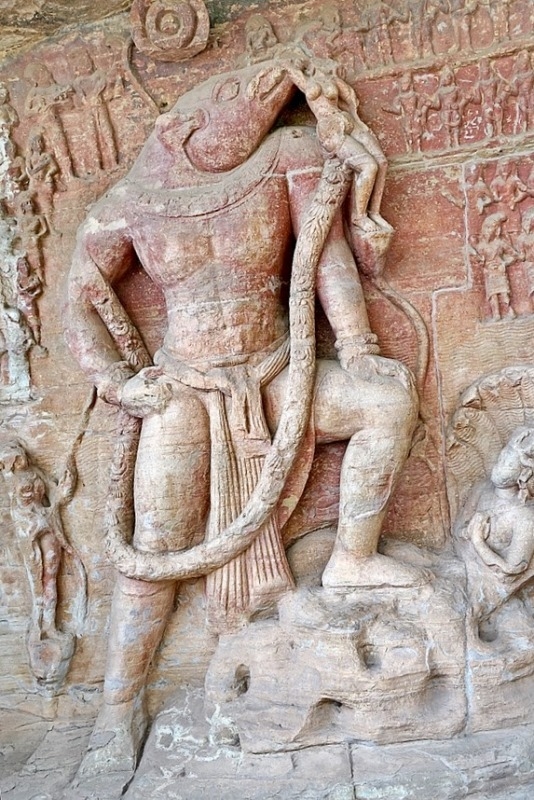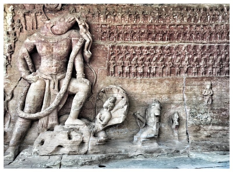 उदयगिरीच्या पांच नंबरच्या गुंफेत असलेले हे महाकाय भित्तीशिल्प बघून आपण अवाक होऊन जातो. हा वराह नृवराह आहे, म्हणजे त्याचे शरीर माणसाचे आणि तोंड तेव्हढे वराहाचे आहे. एक पाय जमिनीवर ठामपणे रोवलेला आणि दुसरा पाय उचलून एका शिळेवर ठेवलेला अश्या आवेशपूर्ण आलीढ मुद्रेत श्रीविष्णू उभे आहेत. वराहमूर्तीच्या पोटऱ्या, पाय आणि एकूणच शरीर अत्यंत सौष्ठवपूर्ण आणि प्रमाणबद्ध आहे.