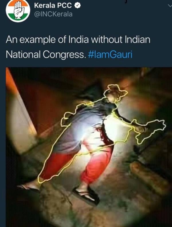 जळत्या चितेवर आपली पोळी भाजून घेण्यात काँग्रेस पक्ष नेहमीच पुढे असतो. राहुल गांधी केरळमध्ये संघाच्या लोकांवर प्राणघातक हल्ले होतात तेव्हा मूग गिळून गप्प बसतात पण गौरी लंकेश ह्यांच्या खुनानंतर थेट पंतप्रधान मोदींना ह्यात गोवून ते मोकळे झाले होते. गौरी लंकेश ह्यांचा खून ज्या बंगळूरमध्ये झाला त्या कर्नाटक राज्यात काँग्रेसचे सरकार आहे आणि कायदा आणि सुव्यवस्थेची जबाबदारी राज्य सरकारवर असते हे एरवी पटकन आठवणारे सत्य राहुल गांधी आणि काँग्रेसचे इतर नेते विसरले आहेत असे दिसते. तिथे केरळ काँग्रेसने तर कहरच केलाय. रक्ताच्या थारोळ्यात पडलेल्या गौरी लंकेश ह्यांच्या मृतदेहाभोवती भारताचा नकाशा काढून त्यांनी ट्विट केलंय हे 'काँग्रेसमुक्त भारताचे' खरे चित्र आहे! हे ट्विट करताना काँग्रेस पक्ष हे विसरलाय की गौरी लंकेश ह्यांचा खून काँग्रेसच्याच राजवटीत झालाय आणि इतकेच नव्हे तर ज्या दाभोलकर आणि कलबुर्गी ह्यांच्या खुनाशी गौरी लंकेश ह्यांच्या खुनाचा संबंध जोडला जातोय त्यांचे दोघांचेही खून काँग्रेसच्याच राजवटीत झाले होते आणि दोघांचेही खुनी अजून सापडलेले नाहीत, आणि आपण लोकशाही प्रक्रियेचे खंदे समर्थक आहोत असे शिरा ताणताणून सांगणारे हे लोक आता कुठल्याही साक्षीपुराव्या शिवाय, कुठल्याही चौकशीशिवाय गौरी लंकेश ह्यांचा खून हिंदुत्ववाद्यांनीच केला असे छातीठोकपणे सांगत आहेत. पुराव्याची ह्यांना गरजच नाही.