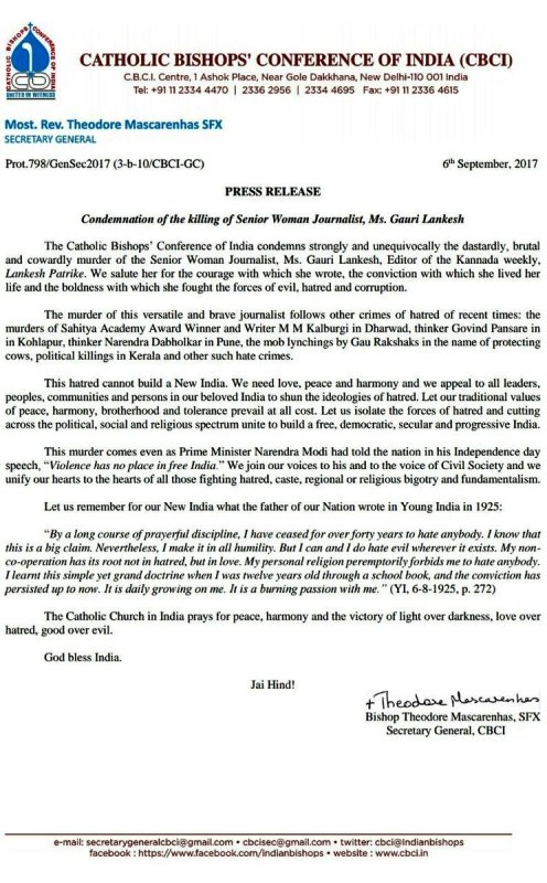 इतके पत्रकार मारले गेले पण मीडियामधल्या कुणीही आजवर हा अभिव्यक्तिस्वातंत्र्यावर हल्ला आहे हो म्हणून भावनांचे उमाळे काढले नव्हते. पण गौरी लंकेशच्या खुनानंतर मीडियामधल्या तथाकथित पुरोगामी लोकांना एकदम जाग कशी काय आली? ऑल इंडिया कॆथॉलिक बिशप कॉन्फरन्स ही ख्रिस्ती लोकांची पूर्णपणे धार्मिक स्वरूपाची संस्था. ह्या संस्थेने आजवर कधी कुठल्या पत्रकाराच्या खुनाची दखल घेतली नाही, पण आता मात्र ह्या संस्थेने गौरी लंकेश ह्यांच्या खुनाच्या निषेधात जाहीर पत्रक काढलंय ज्यात त्यांचा अजेंडा साफ दिसून येतो. ह्या ख्रिस्ती संस्थेचा आणि कारितासचा गौरी लंकेश ह्यांच्या खुनात एव्हढा रस घ्यायचा हेतू काय?