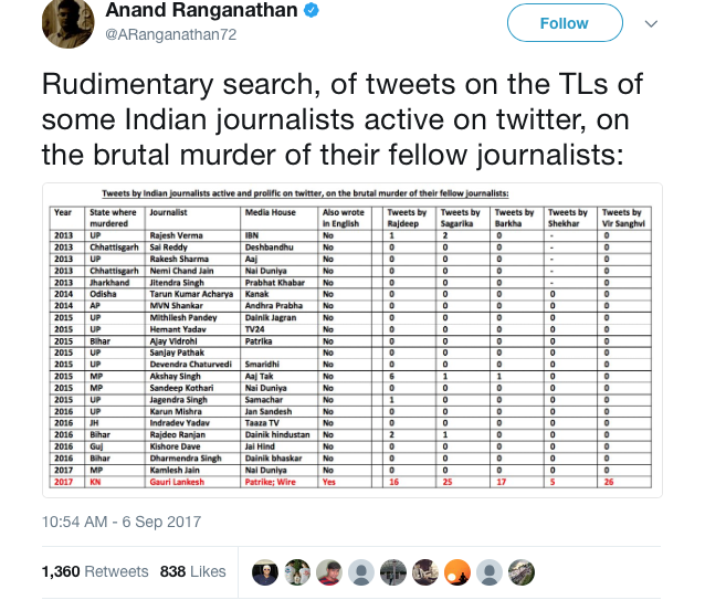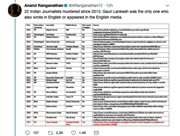 मग ह्या संस्थेचे गौरी लंकेश ह्यांच्या अंत्यसंस्काराच्या वेळी नक्की काय काम होते ? २०१३ पासून आत्तापर्यंत देशाच्या विविध भागात २२ पत्रकारांचे खून झाले. त्यातले २१ पत्रकार भारतीय भाषांमधून लिहीत होते, फक्त एकट्या गौरी लंकेश इंग्रजीमधून लिहीत होत्या.