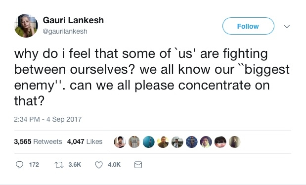 गौरी लंकेश ह्यांच्या मृत्यू होण्यापूर्वीचे त्यांचे शेवटचे ट्विट वाचले तर असं दिसतं की त्या त्यांच्याच विचारसरणीच्या म्हणजे डाव्या विचारांच्या लोकांच्या आपसातल्या भांडणामुळे त्रस्त होत्या.