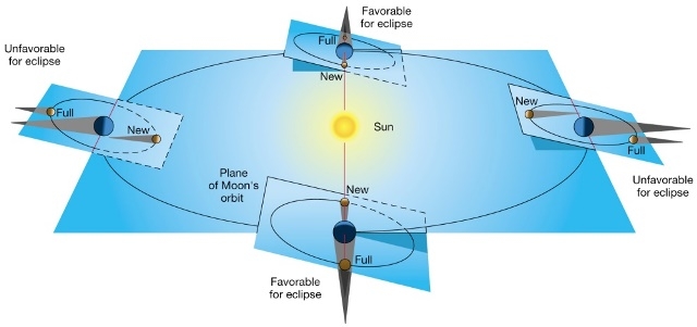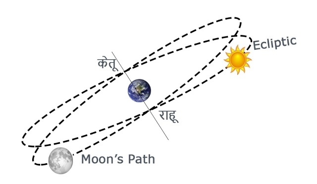 “चंद्राची कक्षा Ecliptic ला ५ अंश कलली आहे. त्यामुळे पृथ्वी ज्या प्रतलात सूर्याभोवती फिरते; चंद्र काही दिवस त्या प्रतलाच्या वर असतो, आणि काही दिवस त्या प्रतलाच्या खाली असतो. चंद्र एका बिंदुला त्या प्रतलाच्या वर चढतो आणि एका बिंदुला खाली उतरतो. या बिंदूंना – Ascending Node व Descending Node असे म्हटले आहे.