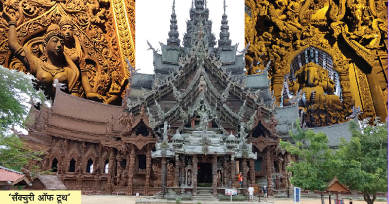 दुसऱ्या दिवशी दुसरी गाडी आणि पुन्हा दुसरा चालक. ‘कोरल आयलंड’ची ही टूर. ‘कोह लार्न’ असे या बेटाचे प्रशासकीय नाव. पटायाच्या मुख्य किनाऱ्यापासून ४५ मिनिटांवर असलेल्या या बेटावर स्पीडबोटने पोहोचण्याआधी समुद्राच्या मध्यभागी एक कृत्रिम बेटासारख्या भागावर पॅरासेलिंगचा मनमुराद आनंद लुटला. आकाशात उंचावरून अवघं पटाया नेत्रतृप्त करून गेलं. बोटीला बांधलेल्या पॅराशूटने हवेत वेगाने घिरट्या घालतानाच्या या खगविहाराची मज्जाच काही और... पायाखाली फक्त निळाशार उसळणारा समुद्र, वर निळेशुभ्र आकाश आणि किनाऱ्यालगतची पटायाची सुंदर स्कायलाईन... दूरवर दिसणाऱ्या पटाया हिल्सवर लिहिलेला ‘पटाया’चा मोठा फलक शोधण्याचा मोह, तर वर पॅरासेलिंग करताना आवरला नाही. त्यानंतर मग पुढे दुपारी ४ पर्यंतचा वेळ कोरल आयलंडच्या किनाऱ्यावर जलक्रीडा करताना कसा गेला, ते कळलंच नाही. स्कुबाडायव्हिंग, स्नॉर्क्लिंग यांसारखे वॉटर स्पोर्ट्सचे भरपूर पर्याय... नितळ, स्वच्छ पाणी आणि पांढरीशुभ्र बारीक वाळू... पाठी हिरवीगार गर्द झाडी... अधूनमधून भुरभुरणारा पाऊस... वाह... फूल्ल पैसा वसूल... कोरल आयलंडला जडमनाने निरोप देऊन पुन्हा पटायाच्या किनारी पोहोचलो आणि नियोजित कार्यक्रमाप्रमाणे भारतीय रेस्टॉरंटमध्ये पंजाबी जेवणावर अगदी तुटून पडलो. सूर्य मावळतीला जायला तरी तासभर होता. उन्हानेही थोडी विश्रांती घेतली होती. मग पोटभर जेवणानंतर निघालो ते ‘सँक्चुरी ऑफ ट्रूथ’ला.