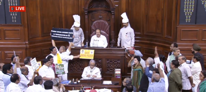 सभागृहाचे कामकाज सुरु झाल्यानंतर काही मुद्दे चर्चासाठी सभागृहासमोर मांडण्यात आले होते. त्यानंतर टीडीपीच्या नेत्यांनी 'आंध्र प्रदेशला विशेष राज्या'चा दर्जा देण्यात यावा, म्हणून जोरदार घोषणाबाजी सुरु केली. सभापतींनी टीडीपी नेत्यांना खाली बसण्याचे आवाहन केले, तसेच चर्चेच्या तासामध्ये यावर चर्चा करण्याचे आवाहन केले. परंतु याकडे पूर्णपणे दुर्लक्ष करत. टीडीपी नेत्यांनी जोदार घोषणाबाजी करण्यास सुरुवात केली. टीडीपीच्या या मागणीला विरोधकांनी देखील पाठिंबा दिला व राज्यांची मागणी पूर्ण करणे हे केंद्र सरकारचे काम असल्याचे म्हणत, सरकार विरोधात घोषणाबाजी करण्यास सुरुवात केली. यानंतर टीडीपी नेत्यांनी सभापतींच्या समोरच्या मोकळ्या जागेत येऊन घोषणाबाजी करण्यास सुरुवात केली. त्यामुळे सभापती व्यंकय्या नायडू यांनी सभागृहाचे कामकाज उद्यापर्यंत तहकूब केले.
