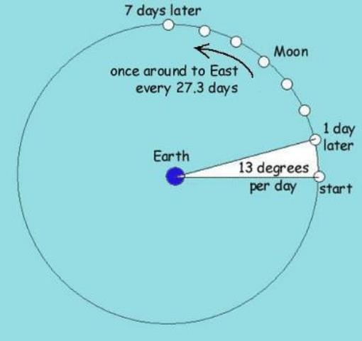“बर! आता नीट उकल करून सांगतो! त्यासाठी आपण चंद्रोदयाच्या ऐवजी चंद्र डोक्यावर असलेली वेळ घेऊ. तर समजा, आज बरोबर ७ वाजता आपल्या गावाचे तोंड चंद्राकडे आहे. म्हणजेच संध्याकाळी ७ वाजता चंद्र आपल्या डोक्यावर आहे. २४ तासात पृथ्वीची स्वत: भोवती एक गिरकी होते. मग २४ तासांनी, दुसऱ्या दिवशी ७ वाजता चंद्र परत डोक्यावर हवा. नाही का?