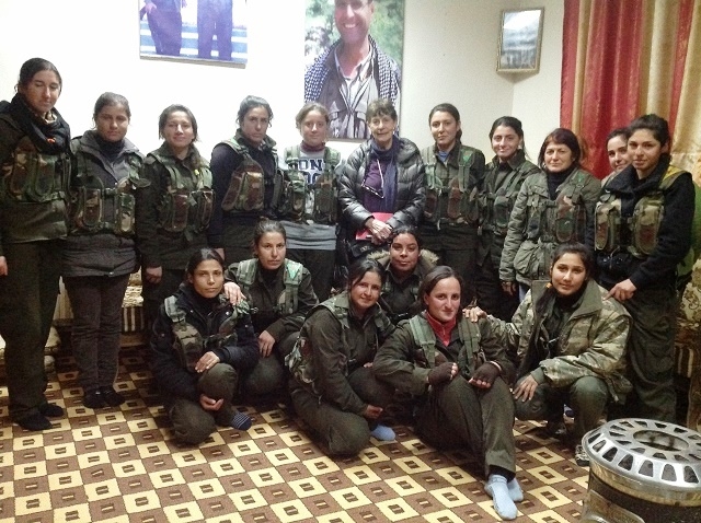 YPG च्या महिला गटासोबत मार्गारेट ओवेन, जानेवारी २०१३ (सौजन्यः Owen, Margaret. Special Report- Gender and justice in an emerging nation: My impressions of Rojava, Syrian Kurdistan, ceasefire magazine, 11 February 2014)