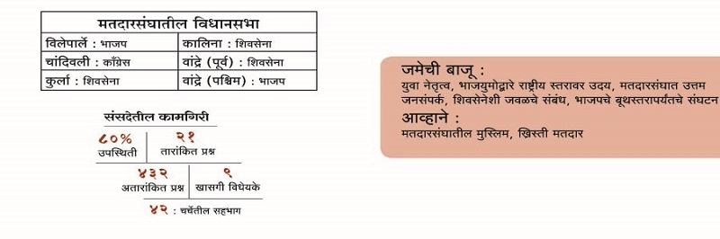 खासदार म्हणून दररोज सकाळी कार्यालयात येऊन बसणे, लोकांच्या संपर्कात राहाणे, गेली अनेक वर्षे रखडलेली कामे मार्गी लावणे या गोष्टी खासदार महाजन यांच्या जमेच्या बाजू आहेतच. कलेक्टर जमिनींवरचा प्रीमियम कमी करून या जुन्या इमारतींच्या पुनर्विकासाचा मार्ग मोकळा करणे,विमानतळानजीकच्या जमिनींवरील लोकांचे पुनर्वसन करणे अशा अनेक गोष्टी यासाठी सांगता येतील. आमदारांच्या द़ृष्टीने शिवसेनाबहुल असलेला हा मतदार संघ भाजप-शिवसेना युती व ठाकरे कुटुंबीयांसाठी असलेल्या जवळच्या संबंधामुळे महाजन यांच्यासाठी सोपा वाटत असला तरी अपारंपरिक मतदाराला पुन्हा मतदान करायला लावणे, हेच महाजन यांच्यासाठीचे आव्हान असेल. प्रिया दत्त यांनी माघार घेऊन पुन्हा लढण्याची केलेली घोषणा त्यांच्या स्वत:च्या मतदाराला किती भावली, हे निकालाच्याच दिवशी लक्षात येईल. मुस्लीम व ख्रिस्ती मतदारांची एकगठ्ठा मते हे प्रिया दत्त यांचे बलस्थान होते. मधल्या पाच वर्षांत फारशा कुठेही न फिरकलेल्या दत्त यांना हीच मते पुन्हा मिळतील, याची शक्यता कमीच आहे. प्रकाश आंबेडकर व ओवेसी यावेळी कोण उमेदवार देतात यावरूनही या मतदार संघातील घडामोडी ठरतील.