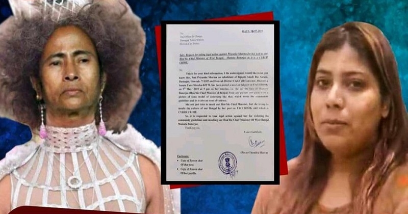 मेट गाला २०१९मध्ये प्रियांका चोप्राने केलेल्या वेषभूषेमध्ये छेडछाड करून प्रियांका चोप्राच्या ऐवजी ममता बॅनर्जींचा चेहरा लावण्यात आला आहे. हा फोटो प्रियांका शर्मा यांनी आपल्या फेसबुक अकाऊंटवरून शेअर केला. अशाप्रकारे मुख्यमंत्र्यांच्या फोटोमध्ये छेडछाड करणे हा अपराध असून ममता बॅनर्जींचा अपमान आहे. हा फक्त ममतांचा अपमान नाही तर बंगालच्या संस्कृतीचा अपमान असल्याचा आरोप, हाजरा यांनी दाखल केलेल्या तक्रारीमध्ये करण्यात आला आहे. हाजरा यांनी दाखल केलेल्या तक्रारीनंतर पोलिसांनी प्रियांका शर्मा यांना अटक केली आहे.