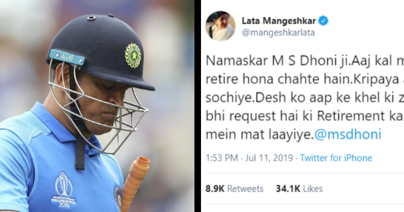 भारत विरुद्ध न्यूझीलंडमध्ये झालेल्या वर्ल्डकपच्या उपांत्य फेरीत झालेल्या पराभवानंतर चाहते आधीच दुःखात होते त्यात सर्वांच्या लाडक्या महेंद्र सिंह धोनीच्या निवृत्तीविषयी चर्चा होत असल्यामुळे तर अनेकांना अश्रू अनावर झाले. या पार्श्वभूमीवर स्वरसम्राज्ञी लता मंगेशकर या देखील भावूक झाल्या आहेत. त्यांनी धोनीला ट्विटरच्या माध्यमातून निवृत्त न होण्याची विनंती केली. "भारतीय क्रिकेट संघाला तुझी गरज आहे" असे म्हणत त्यांनी माहिचे मन वळवण्याचा एक प्रयत्न केला आहे.