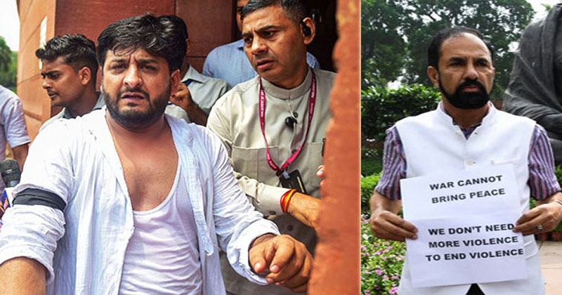 गृहमंत्री अमित शहा यांच्या यांनी कलम ३७० रद्द करण्याविषयी राज्यसभेत चर्चा व्हावी यासाठी सदनातील सर्व सदस्यांना आवाहन केले. मात्र विरोधकांनी गदारोळ करत शहांच्या भाषणात अडथळा आणण्याचा प्रयत्न केला. २ पीडीपीचे नेते नजीर अहमद लवे आणि एमएम फैयाज यांनी विरोध करताना संसदेत संविधान फाडण्याचा प्रयत्न केला. खासदार फैयाज एवढ्यावरच थांबले नाहीत तर त्यांनी स्वतःचे कपडेदेखील फाडले. त्यानंतर या खासदारांना बाहेरचा रस्ता दाखवण्यात आला.