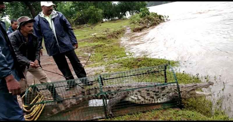 मुंबई ( अक्षय मांडवकर ) : मुसळधार पडणाऱ्या पावसामुळे चिपळूणमधील वाशिष्ठी आणि शीव नदीतील पाण्याच्या पातळीत वाढ झाल्याने शहरात अजस्त्र मगरींनी शिरकाव केला आहे. चिपळूण रेल्वेस्थानकापासून व्यापारी संकुले आणि मानवी वस्त्यांमध्ये मगरींचा वावर आढळून येत आहे. या मगरींची सुखरूप सुटका करण्यासाठी वनविभाग तत्परतेने काम करत असून गेल्या महिन्याभरात शहरातील विविध भागांमधून नऊ मगरींचा बचाव करण्यात आला आहे.
