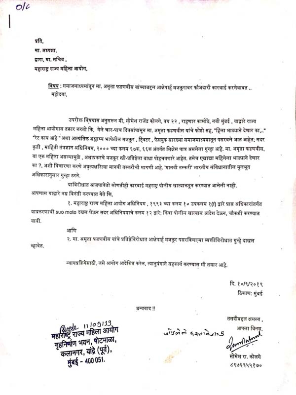आक्षेपार्ह मजकूर प्रसारित करणाऱ्यांनी यावेळी स्वतःच्या नावासह जातीचे नाव जोडण्याचेही दुःसाहस केले. हा प्रकार म्हणजे माहिती-तंत्रज्ञान कायदा व भारतीय दंडविधान संहितेनुसार गुन्हा ठरत असून तशा मजकुरामुळे अप्रत्यक्षरित्या मानवी तस्करीस प्रोत्साहन दिले जाऊ शकते. त्यामुळे याविरोधात बुधवारी राज्य महिला आयोगात सोमेश कोलगे यांनी तक्रार दाखल केली. अमृता फडणवीस या महिला असून, त्यांच्या प्रतिष्ठेविरोधात सोशल मीडियावर पसरवल्या जाणाऱ्या मजकुराची चौकशी करून संबंधितांना शिक्षा व्हावी, अशी मागणी करण्यात आली आहे. राज्य महिला आयोग अधिनियमानुसार कलम १० अंतर्गत स्वतःहून दखल घेत चौकशी केली पाहिजे, असेही तक्रारीत नमूद करण्यात आले आहे.