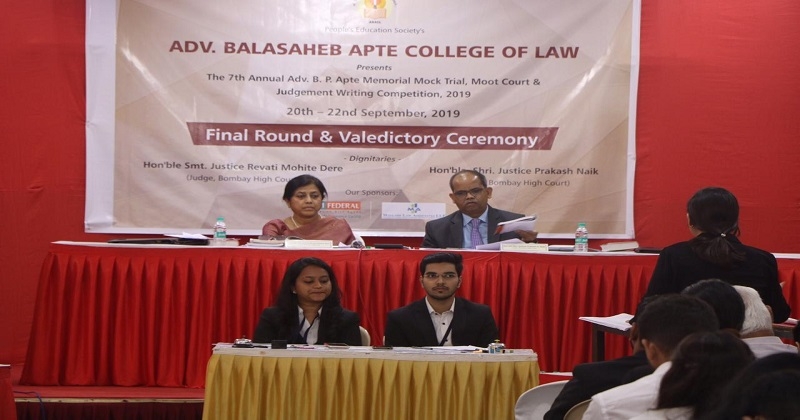 मुंबई: दादर येथील बाळासाहेब आपटे विधी महाविद्यालयाच्या वतीने २१ ते २३ सप्टेंबर २०१९ रोजी प्रारूप-न्यायालय व निकालपत्रलेखन स्पर्धा पार पडली. स्पर्धेत २४ संघांनी व ४८ स्पर्धकांनी सहभाग नोंदवला. अंतिम फेरीचे परीक्षण मुंबई उच्च न्यायालयाचे न्यायमूर्ती मा. प्रकाश नाईक व मा. मोहिते-डेरे यांनी पहिले. पारितोषिक वितरणाचा कार्यक्रमही उच्च न्यायालयाच्य न्यायमूर्तींच्या हस्ते पार पडला.