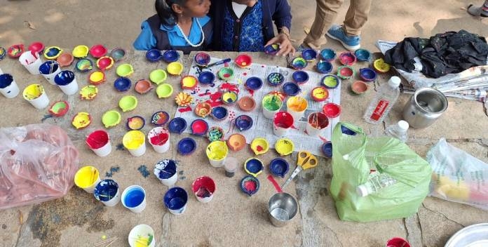 यावेळीही दिवाळी साजरी करायला आम्ही विक्रमगड आणि वाड्याच्या शाळांना भेट द्यायचे ठरवले. यानिमित्ताने चित्रकार श्री.बा.च्या कला कार्यशाळेचे आयोजन केले होते. विक्रमगडच्या सुकसाळे जि. प. शाळेत बोरसेपाडा आणि टोपलेपाडा शाळेतील मुलं येणार होती. या मुलांसाठी पणती रंगविणे, एन्व्हलप पेंटिंग आणि रांगोळीचा टीप कागद तयार करणे, हा कलाप्रकार नवीनच होता. नक्की काय करायचं आहे, याबद्दल उडालेला गोंधळ प्रत्येक मुलाच्या चेहर्यावर स्पष्ट दिसत होता. ओमकार दादाने मग नेहमीप्रमाणे आपल्या शैलीत मुलांशी बोलायला सुरुवात केल्यावर त्यांना आता कळू लागले की, काहीतरी भारी शिकणार आहोत आपण आज! चित्रकार श्री.बा.नेमग त्याची कल्पना सांगितली आणि मुलं लागली कामाला! इयत्तेप्रमाणे तीन-तीन गट केले. पणत्या रंगविण्याचे काम छोट्या मुलांना देण्यात आले. चौथी, पाचवीच्या मुलांना रांगोळी टीप कागद आणि सहावी, सातवीला एन्व्हलप पेंटिंग. श्री.बा.ने मुलांना आजूबाजूच्या परिसरातील पानं, फूलं, गवत, वेल, जे जे दिसेल आणि आवडेल ते ते घेऊन यायला सांगितले.