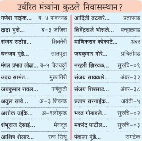 पर्यावरणमंत्री पंकजा मुंडे यांना पर्णकुटी, मंत्री गिरीश महाजन यांना सेवासदन, तर मंत्री गुलाबराव पाटील यांना जेतवन बंगला देण्यात आला आहे. विधान परिषदेचे सभापती राम शिंदे यांना ज्ञानेश्वरी, विधानसभा अध्यक्ष राहुल नार्वेकर शिवगिरी, मंत्री चंद्रकांतदादा पाटील यांना ब-१ सिंहगड देण्यात आला आहे.