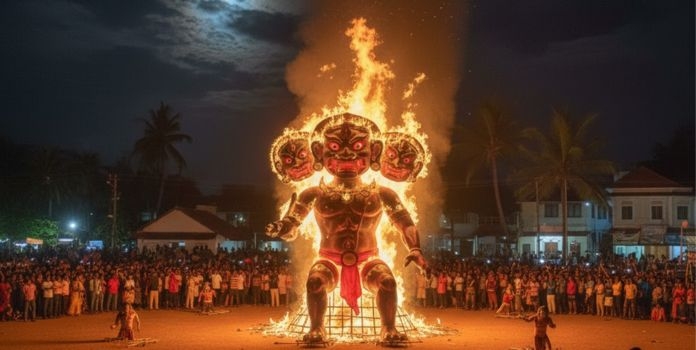 गोव्यातील दिवाळीच ( Diwali ) आकर्षण म्हणजे ‘नरकासुर दहन’. गोव्यात नरक चतुर्दशीला नरकासुराचा भव्य पुतळा बनवून तो फटाक्यांची आतिषबाजी करत जाळला जातो. ही अनोखी परंपरा पाहण्यासाठी लोकांची तुफान गर्दी पाहायला मिळते.