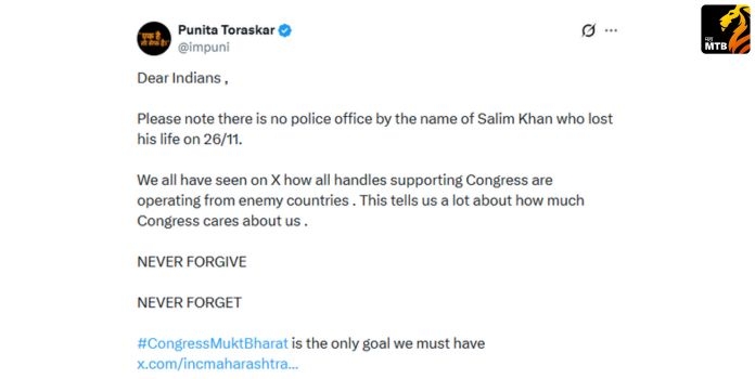 मुंबई : (Salim Khan) सध्या महाराष्ट्र काँग्रेसची एक्सवरील एक पोस्ट भलतीच व्हायरल होतेय. या पोस्टमध्ये महाराष्ट्र काँग्रेसने (Maharashtra Congress) २६/११ च्या हल्ल्यात शहीद झालेल्या महाराष्ट्र पोलिसांना श्रद्धांजली वाहिली आहे. त्यासोबतच त्यांच्या नावांची यादी देखील टाकली आहे, ज्यात सलीम खान (Salim Khan) या नावाचाही सामावेश आहे. मात्र खरं तर, सलीम खान (Salim Khan) नावाची अशी कोणतीही व्यक्ती अस्तित्वात नाही. त्यामुळे महाराष्ट्र काँग्रेसने (Maharashtra Congress) जाणूनबुजून या यादीत एका मुस्लिमाचे नाव जोडले असावे यात काही शंका नाही.