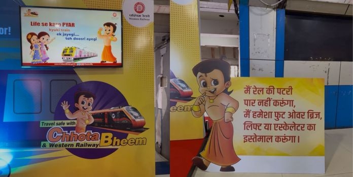 मुंबई : पश्चिम रेल्वेने रेल्वे प्रवासी सुरक्षा उपक्रमात लोकप्रिय कार्टून पात्र 'छोटा भीम' च्या सहकार्याने एक नवीन सुरक्षा जागरूकता मोहीम सुरू केली आहे. यामोहिमेचा मुख्य उद्देश प्रवाशांना चालत्या ट्रेनमध्ये चढणे किंवा उतरणे या धोक्यांबद्दल जागरूक करणे आहे. ही मोहीम मुंबई सेंट्रल आणि रतलाम विभागांतर्गत चर्चगेट आणि इंदूर स्थानकांवर अनुक्रमे सुरू करण्यात आली. ही मोहीम १५ दिवसांच्या कालावधीत अंधेरी, बोरिवली, उज्जैन आणि रतलाम स्थानकांवर देखील राबवली जाईल.