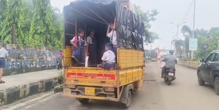 कल्याण : अंबरनाथ मधील अपघाताच्या घटनेने संपूर्ण राज्याला हादरवून सोडले असतानाच कल्याणात एका खाजगी शाळेतील विद्यार्थ्यांना चक्क एका मालवाहतूक करणाऱ्या टेम्पोमधून शाळेत ने-आण केली जात आहे. विशेष म्हणजे मुलांच्या सुरक्षिततेसाठी एक ही अटेंडंट (सहाय्यक) सोबत नाही. विद्यार्थ्यांचा धोकादायक प्रवास सुरू असताना आरटीओच्या अधिकाऱ्याचे मात्र त्याकडे दुर्लक्ष होताना दिसत आहे. त्यामुळे अपघात झाल्यानंतरच जाग येणार का असा प्रश्न आता सर्वसामान्यांकडून विचारला जात आहे.