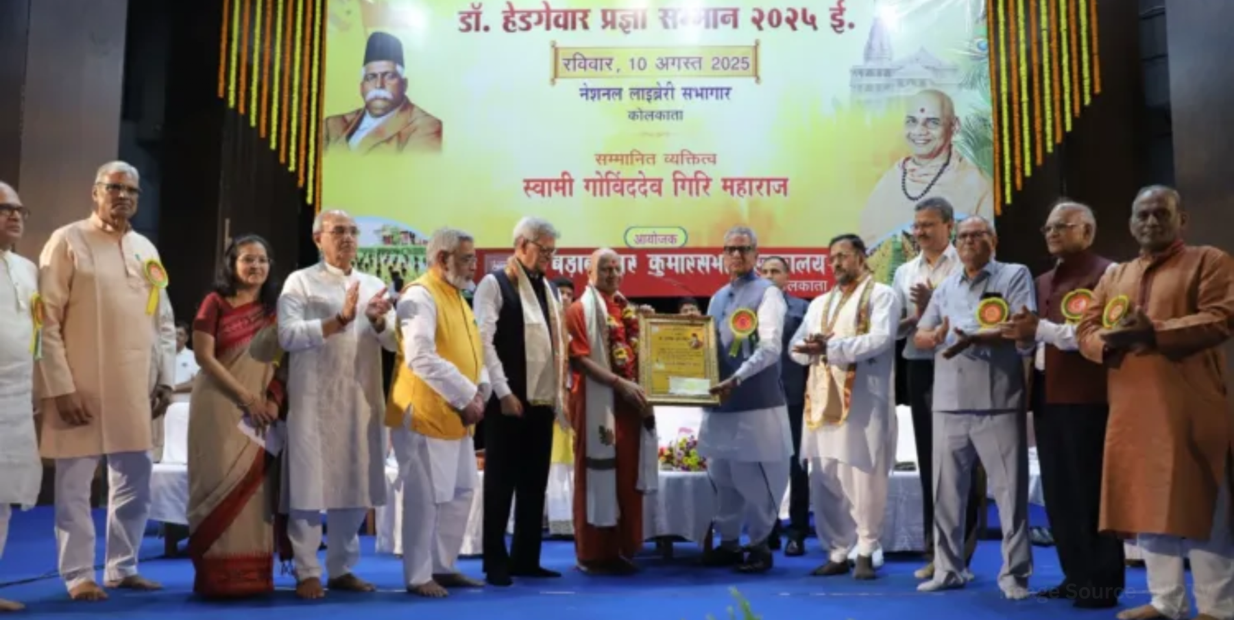 मुंबई : श्रीराम जन्मभूमी तीर्थक्षेत्र न्यासचे कोषाध्यक्ष पूज्य महंत स्वामी गोविंददेव गिरी महाराज यांना '३६ वा डॉ. हेडगेवार प्रज्ञा सन्मान' नुकताच प्रदान करण्यात आला. हा सन्मान सोहळा रविवारी कोलकाता येथे श्री बडाबाजार कुमारसभा वाचनालयाच्या वतीने नॅशनल लायब्ररी सभागृहात आयोजित करण्यात आला होता. यावेळी सन्मानस्वरूप एक लाख रुपयांचा धनादेश आणि मानपत्र प्रदान करण्यात आले.