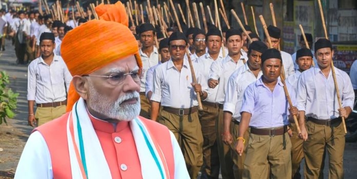 मुंबई : "सेवा, समर्पण, संगठन, अप्रतिम अनुशासन ही राष्ट्रीय स्वयंसेवक संघाची ओळख राहिली असून त्यास शंभर वर्षांच्या समर्पणाचा इतिहास आहे", असे प्रतिपादन पंतप्रधान नरेंद्र मोदी यांनी केले. भारताच्या ७९ व्या स्वातंत्र्यदिनाचे औचित्य साधून लाल किल्ल्यावर ध्वजारोहणाचा कार्यक्रम संपन्न झाला. त्यावेळी ते बोलत होते.