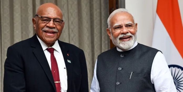 नवी दिल्ली, फिजीचे पंतप्रधान सिटीवेनी राबुका हे सध्या भारत दौऱ्यावक आहेत. त्यांनी सोमवारी पंतप्रधान नरेंद्र मोदी यांची भेट घेतली. यावेळी दोन्ही देशांमध्ये संरक्षण, आरोग्य, हवामान बदल, कृषी, व्यापार आणि संस्कृती अशा अनेक क्षेत्रांत सहकार्य वाढवण्यासाठी महत्त्वपूर्ण करार झाले.