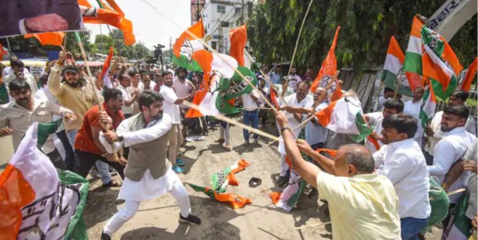 पाटणा : (Bihar) बिहारच्या दरभंगा येथील राजद आणि काँग्रेसच्या एका संयुक्त सभेत व्यासपीठावरून पंतप्रधान नरेंद्र मोदी यांच्याविषयी आक्षेपार्ह भाषा वापरली गेली. त्यानंतर बिहारच्या पाटणा येथील काँग्रेस मुख्यालयाबाहेर भाजप कार्यकर्त्यांनी आंदोलन केले. त्यावेळी दोन्ही पक्षांच्या कार्यकर्त्यांमध्ये तुफान राडा झाला आहे.