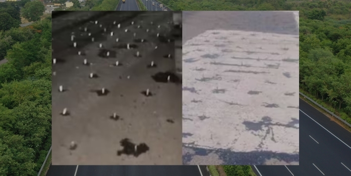 कंत्राटदारावर दंडात्मक कारवाईया घटनेची माहिती मिळताच महामार्ग गस्त वाहन रात्री १२.३६ वाजता घटनास्थळी पोहोचले होते. सुदैवाने या ठिकाणी कोणताही अपघात किंवा जीवितहानी झालेली नाही. तसेच, 'इपॉक्सी ग्राउटिंग'साठी लावण्यात आलेले ‘अॅल्युमिनिअम नोजल्स' दि.१० सप्टेंबर रोजी पहाटे ५ वाजता काढण्यात आले. दरम्यान, या ठिकाणी 'ट्रॅफिक डायव्हर्जन'साठी पुरेशी सुरक्षा व्यवस्था नसल्याचे दिसून आले. त्यामुळे संबंधित कंत्राटदारावर दंडात्मक कारवाई करण्यात येत असल्याचेही एमएसआरडीसीने म्हटले आहे.