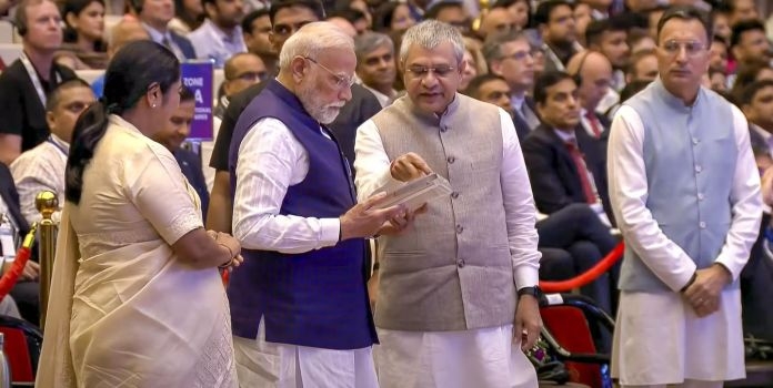 #WATCH | At Semicon India 2025, Union Minister for Electronics & Information Technology, Ashwini Vaishnaw presents Vikram 32-bit processor and test chips of the 4 approved projects to PM Narendra Modi.