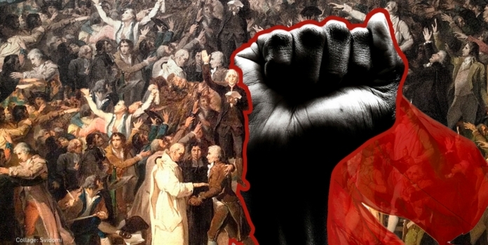 मार्सच्या सततच्या संघर्षाच्या प्रतिपादनास फ्रेंच राज्यक्रांतीची पार्श्वभूमी होती. आज मार्सवादाला ‘डावा विचार’ असे जे संबोधले जाते, त्यास फ्रेंच राज्यक्रांतीनंतर स्थापन झालेल्या राष्ट्रीय सभेत डावीकडे बसणार्या जहाल जॅकोबिन गटाचा संदर्भ आहे. संघर्ष आणि अराजकता ही दोन्ही लक्षणे जॅकोबिन गटाचीच होती परंतु, मार्स फ्रेंच राज्यक्रांतीचा सैद्धांतिक विचारही काही प्रमाणात नाकारतो. कोणत्याही राष्ट्रीय समाजाचे अस्तित्व नाकारून केवळ आर्थिकदृष्ट्या शोषक आणि शोषित असे दोनच वर्ग मानल्याने आणि त्यातील शोषित वर्गाची संपूर्ण सत्ता स्थापित झाल्याशिवाय संघर्ष सुरूच ठेवण्याचे मानल्याने, मार्सचा विचार सर्व आधीच्या तत्त्वचिंतकांशी फारकत घेऊन नवा विचार मांडतो.