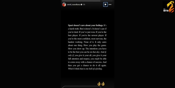 खेळ कधीच तुमच्या भावनेची कदर करत नाही. हे एक कटू सत्य आहे. तुम्ही थकला आहात की नाही याची त्याला पर्वा नाही. तुम्ही थकलेले असाल, नुकतेच जिंकला असाल, सर्वोत्तम खेळाडू असाल किंवा अगदी नवखे असला तरीही... खेळाला यापैकी कशाचीच फिकीर नसते. तुम्ही किती आत्मविश्वासात आहात किंवा किती नर्वस आहात, यानेही काही फरक पडत नाही, असं स्मृती मानधनाने इन्टाग्राम स्टोरीमध्ये लिहिलं आहे.