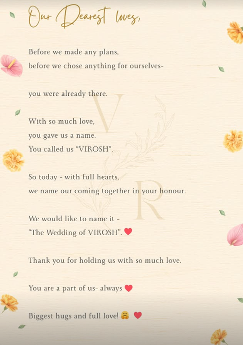 रविवारी दोघांनी इन्स्टाग्राम स्टोरीवर भावनिक पोस्ट शेअर करत चाहत्यांना सरप्राइज दिलं. “तुम्ही आम्हाला प्रेमाने एक नाव दिलं VIROSH. त्यामुळे आज आम्ही आमच्या या मिलनालाही तेच नाव देत आहोत,” असं त्यांनी पोस्टमध्ये लिहिलं. चाहत्यांच्या प्रेमाबद्दल आभार मानत त्यांनी हा सोहळा ‘विरोशचं लग्न’ म्हणून संबोधलं.