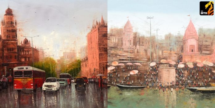 मुंबई आणि कोलकाता ही दोन शहरं, उद्यमशीलतेसाठी प्रसिद्ध. त्यामुळे माणसाच्या जगण्यामध्ये हा जो भिनलेला व्यवहार आहे, तो शहराच्या जडणघडणीमध्ये पुरेपूर उतरला. तैलचित्रांच्या माध्यमातून ही चित्रं साकारताना, शहरांची विविध स्तरांमधली जडणघडण आपल्याला बघायला मिळते. उदाहरणार्थ, मुंबई शहर हे आपल्या वेगासाठी ओळखलं जातं. हीच मुंबई पावसामध्ये मात्र स्वतःचं वेगळं रूप घेऊन लोकांसमोर उभी ठाकते. मुंबईतील पाऊस दर्शवताना मातीच्या रंगाच्या विविध छटा यावेळी चित्रकाराने तिथल्या इमारतींना दिलेल्या दिसतात. पहिल्या पावसानंतर मातीचा येणार सुगंध हा जितका मोहक असतो, तीच संपन्नता या चित्रामध्येही बघायला मिळते. दुसऱ्या बाजूला, ‘गेटवे ऑफ इंडिया’ आणि भोवतालचा परिसर ‘कॅनव्हास’वर चितारताना हेच सौंदर्य आपल्याला बघायला मिळतं. आकाश रंगवण्यासाठी वापरले गेलेले फिकट पिवळे आणि गुलाबी रंग सकाळच्या कोवळ्या उन्हाची अनुभूती देतात. मुंबई कधीही थांबत नाही. मात्र, तरीसुद्धा या शहराच्या अंतरंगात कुठेतरी शांतता आहे, संयम आहे, याची आपल्याला यातून प्रचिती येते. त्याचबरोबर विविध रंगांचा चष्मा लावल्यावर ही शहरं आपल्याला कशी दिसतील, याची प्रचितीसुद्धा काही निवडक चित्रांच्या माध्यमातून चित्रकाराने साकारली आहे. प्रत्येक शहराचं स्वतःचं असं एक जीवन असतं. कारण, प्रत्येक शहर जिवंत असतं. वेगवेगळ्या तऱ्हेने शहरं वाढत राहतात, माणसं वस्त्या करत जातात. हा जिवंतपणा कागदावर आणण्यात चित्रकार यशस्वी झाला आहे. मुंबईमध्ये 20 वर्षांहून अधिक काळ वास्तव्य केल्यानंतर आता-आता या शहराची रूपरेखा मला उमजायला लागली आहे, असं मत चित्रकाराने व्यक्त केलं.