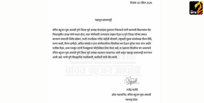 पुणे : (Baramati by-election) बारामती विधानसभा पोटनिवडणुकीच्या पार्श्वभूमीवर मोठी राजकीय घडामोड समोर आली आहे. वंचित बहुजन युवा आघाडीच्या पुणे जिल्हा (पूर्व) अध्यक्षपदावर कार्यरत असलेले मंगलदास तुकाराम निकाळजे यांची पक्षातून हकालपट्टी करण्यात आली आहे. पक्ष शिस्तीचा भंग केल्याचा ठपका ठेवत ही कारवाई करण्यात आली. (Baramati by-election)